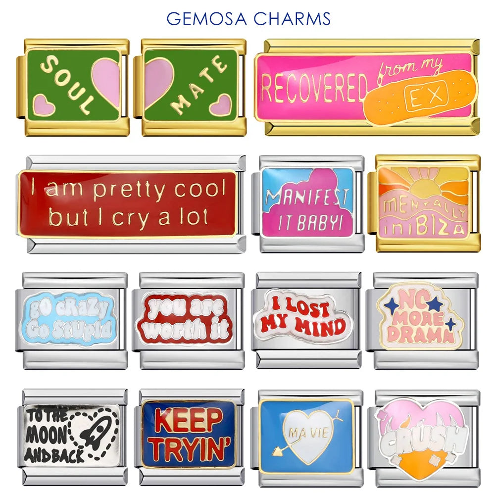 Mit den Sprüche-Charms kannst du deine Stimmung und Persönlichkeit ausdrücken. Diese charmanten Anhänger aus hochwertigem Edelstahl sind nicht nur modische Accessoires, sondern auch eine Erinnerung an deine Lebensphilosophie. Perfekt, um deinem Armband eine persönliche und kraftvolle Note zu verleihen.